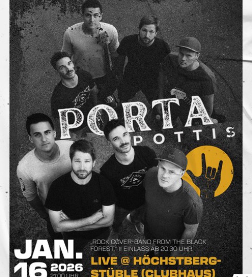 Ab ca. 21:00 Uhr spielen die Porta Pottis im Clubhaus. Die Rock-Coverband aus dem Hochschwarzwald sorgt für die passende musikalische Weiterführung des Abends.